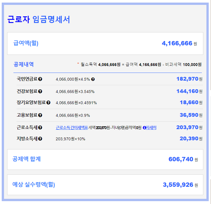 근로소득세와 지방소득세 등 까지 모든 내역이 60만원 가량이나 되기 때문에 실제 총 급여액인 4,166,666원에서 이를 차감한 3,559,926원이 실제 5천만원 연봉인 사람이 받게되는 급여 실수령액 이라고 볼 수 있습니다.