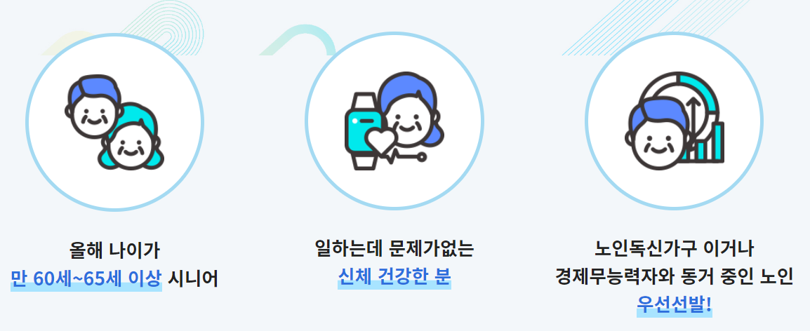 가장 먼저 나이 자격입니다. 신청을 위해서는 고령자를 위한 일자리로 꾸려져 있기 때문에 올해 나이가 적어도 만 60세 이상이어야 노인일자리에 신청할 수 있는 것 입니다.