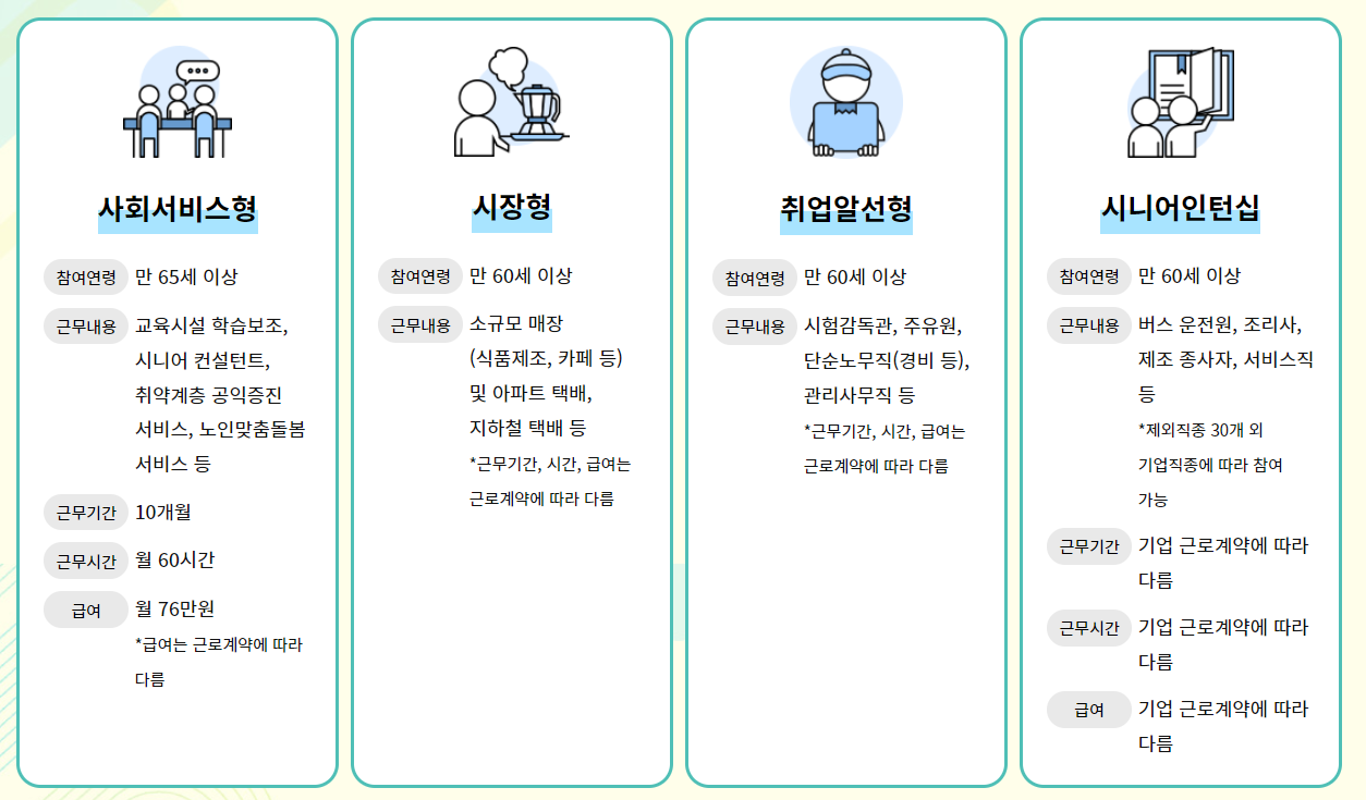 좀 더 많은 급여를 받고 싶은 분들은 공공형 일자리보다는 시장형, 취업알선형, 시니어 인턴셉 등에서 노인일자리 유형을 선택하시는 것을 권장 드립니다.