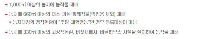 지금부터 안내해드리는 아래 요건을 충족함과 동시에 재배 품목이나 사육 규모 등이 현장확인이 가능한 시점에 신청할 수 있습니다.
