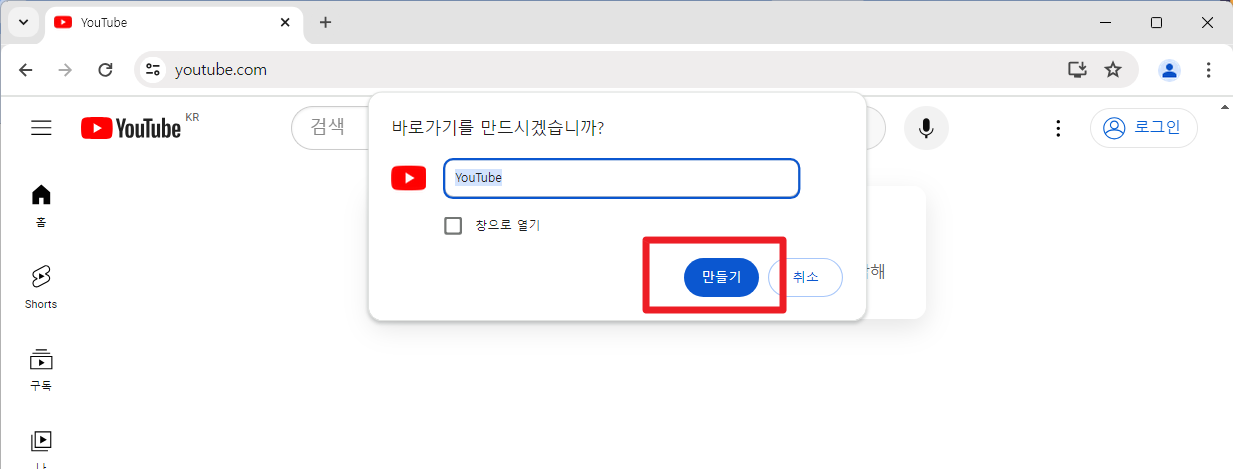 [바로가기 만드시겠습니까?] 창이 뜨면 [만들기]를 클릭해줍니다.