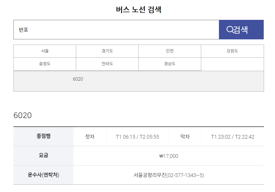 '반포'를 검색했더니 6020번 버스가 조회되었는데요, 해당 버스 번호를 클릭하면 하단에 버스요금이 조회됩니다.