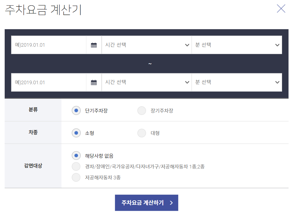 위 버튼을 클릭하면 아래와 같은 페이지에서 해당 버튼을 통해 예상 주차요금을 미리 파악해볼 수 있습니다.