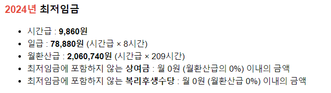 결론부터 말씀드리면 최저시급인 9,860원을 받을 경우 월급이 206만740원이 됩니다. 연봉으로 계산했을 때는 24,728,880원입니다.
