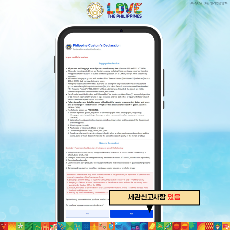 세관신고를 하려면 오른쪽 yes버튼을 클릭해주시면 됩니다. 만약 이와 같은 전자 세관신고를 미리 해둘경우 비행기 내에서 세관신고서를 별도로 작성할 필요가 없습니다.