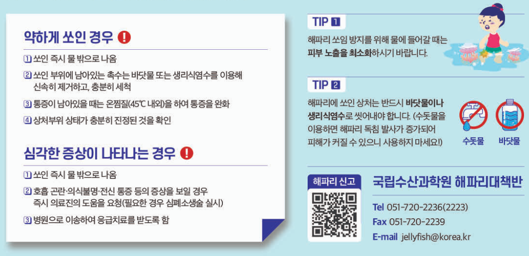 해수면 온도가 높아짐에 따라 우리나라에서도 10여년 전부터 해파리가 출몰하는 해변이 많아지고 있습니다. 해파리를 보았을 때는 반드시 안전 요원에게 이야기 해서 해파리를 바다에서 꺼낼 수 있도록 하고 죽은 해파리라고 하더라도 만지지 않는 것을 권장 드립니다.