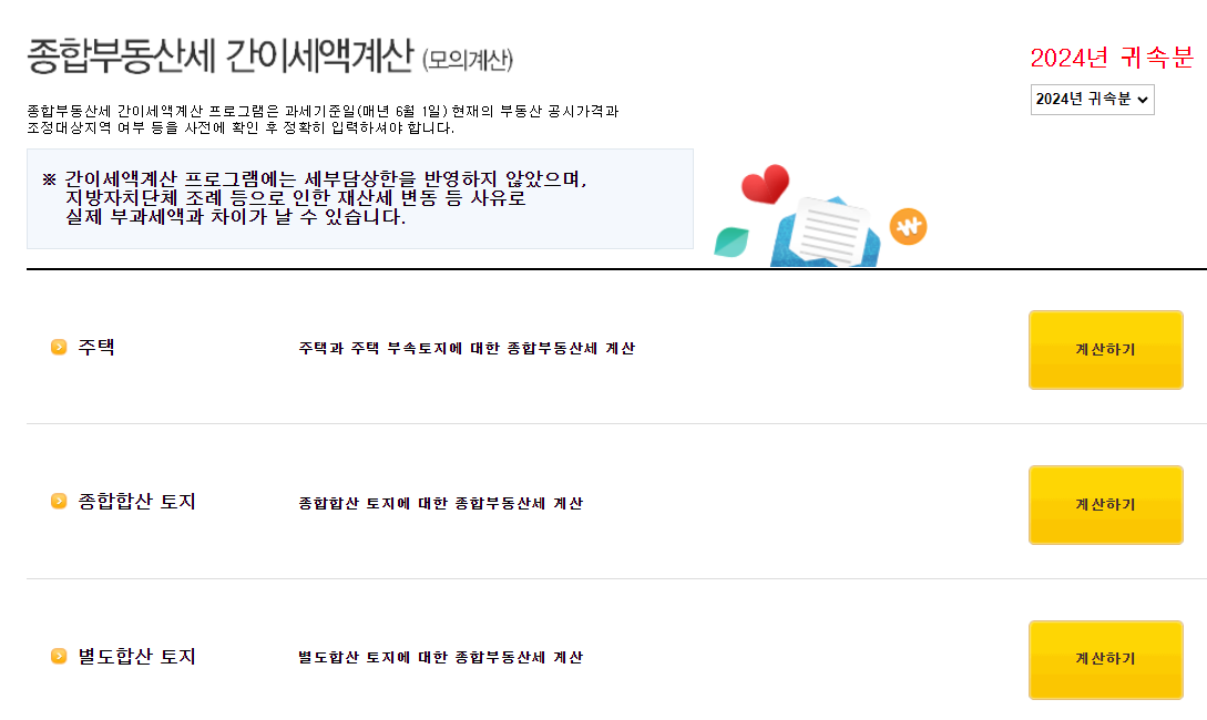 위 계산기를 클릭하시면 아래처럼 종합부동산세 계산할 수 있는 페이지로 이어집니다. 2024년 귀속분에 대한 세금 계산을 할 수 있도록 적용되어있는데요 국세청에서 제공하는 이와 같은 보유세 계산기를 통해 직접 계산을 진행해볼 수 있습니다.